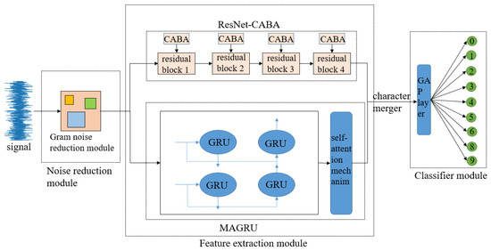 The CABA-GMNR-MAGRU model designed in this text is mainly composed of a denoise module, a feature extraction module, and a classifier module. The noise reduction module is composed of a Gram denoise module, and the feature extraction module is composed of a ResNet-CABA module and a MAGRU module. The classifier module is composed of a global average pooling layer and a Softmax function layer, and the precise architectural configuration is graphically delineated in Figure 6.