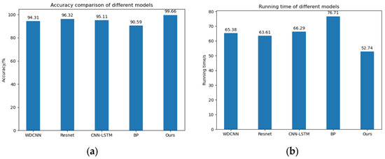 Diagnostic accuracy and running time of the five models. (a) Diagnostic accuracy of the five models. (b) Running time of five models.