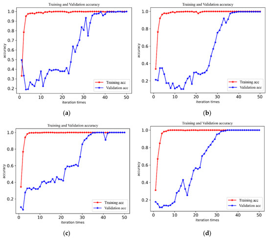 To check the accuracy and stability of the fault diagnosis of the CABA-GMNR-MAGRU model proposed in the paper in the various working environments, vibration signal datasets with a load of 0 hp–3 hp were used to verify the model. The training environment and other configurations were the same as above. Under each load, the model proposed in this paper was used for 50 iterations, and the precision lines of the model in the four load environments were obtained, as shown in Figure 9.
