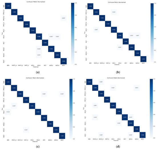 Model diagnosis confusion matrix under four loads. (a) The diagnostic confusion matrix of the model when the load is 0 hp. (b) The diagnostic confusion matrix of the model when the load is 1 hp. (c) The diagnostic confusion matrix of the model when the load is 2 hp. (d) The diagnostic confusion matrix of the model when the load is 3 hp.