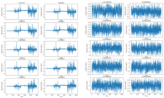Maintaining the precision of bearing trouble diagnosis in various-intensity noise environments is an important topic of fault diagnosis. The CABA-GMNR-MAGRU model proposed in this paper uses the Gram denoise module (GMNR) for noise reduction. In order to verify the noise reduction ability of the model, Gaussian noise and impulse noise with different SNRs were added to the bearing dataset used above to simulate the influence of noise on fault diagnosis under actual working conditions. The data timing diagram of the dataset before and after adding Gaussian noise is shown in Figure 11.