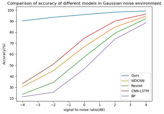 The diagnostic accuracy of the five models in different signal–noise ratios in a Gaussian noise environment.