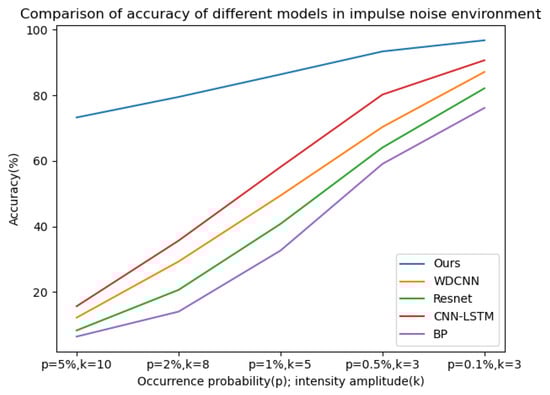 Gaussian noise with SNRs of −4 db to 4 db and impulse noise with a probability of occurrence (p) and intensity amplitude (k) of 5% and 10, 2% and 8, 1% and 5, 0.5% and 3, 0.1% and 3, respectively, were added to the bearing dataset with a load of 0 hp. The probability of occurrence here refers to the probability of contamination of each data point, and the intensity amplitude refers to the multiple of the noise amplitude relative to the standard deviation of the signal. Fourteen datasets were used to verify the model, and the training environment and other configurations were the same as above. The model proposed in this paper was used for 50 iterations in each SNR and combined noise environment, and then the four classical deep learning models (WDCNN, Resnet, CNN-LSTM, BP) mentioned above were used for 50 iterations in the noise environment of the same SNR and combined as a comparative experiment; five experiments were carried out, and the average value of the experimental results was taken. The curves of diagnostic accuracy of the five models in different Gaussian noise intensity and pulse environments are shown in Figure 12 and Figure 13.