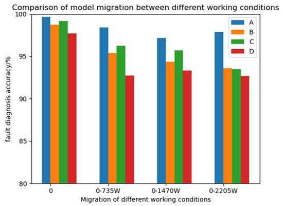 Using the bearing datasets of four different loads used above, the model was trained under the condition of 0 hp load and then directly migrated to the conditions of 1 hp (735 W), 2 hp (1470 W), and 3 hp (2205 W) load. All the data were the data of the validation set, and the training environment was the same as above. At the same time, three classical attention mechanism modules, CBAM [30], SE [31], and ECA [32], were selected to replace the CABA module in the CABA-GMNR-MAGRU model proposed in this paper as a comparative experiment. For the convenience of observation, the model replaced by the CBAM module is named Model B, the model replaced by the SE module is named Model C, the model replaced by the ECA module is named Model D, and the CABA-GMNR-MAGRU model proposed in this paper is named Model A. The specific results are shown in Table 4 and Figure 14.