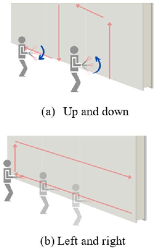 Illustration of the RGB-D data acquisition protocol used in StructScan3D v1. (a) Vertical (up and down) scanning motion to capture wall height and ceiling detail. (b) Horizontal (left to right) sweep to ensure full coverage along walls and furniture lines.