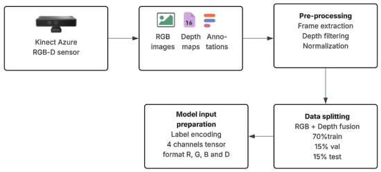 To summarize, Figure 4 illustrates the StructScan3D v1 dataset pipeline, from initial acquisition to model-ready input preparation. RGB-D data was collected using a handheld Azure Kinect sensor in real indoor environments.