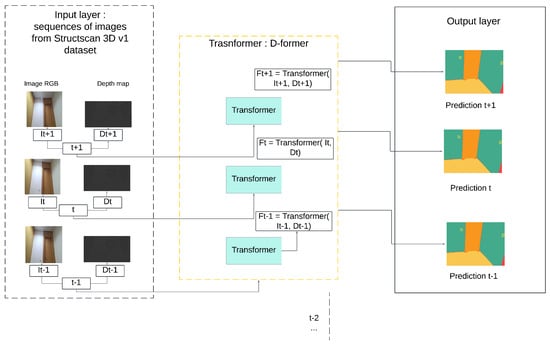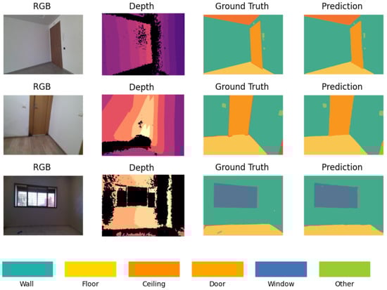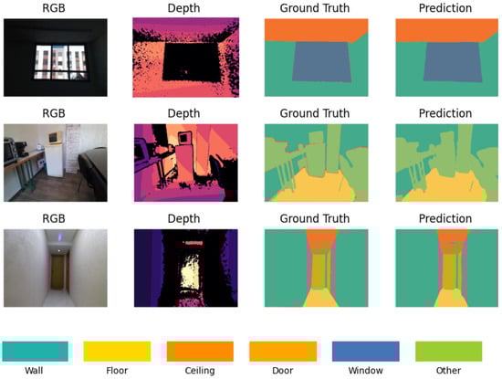 The qualitative analysis offers a visual assessment of the D-Former model’s segmentation performance by comparing the predicted segmentation maps against the ground truth annotations for RGB-D inputs. Representative results are presented in Figure 8, showcasing three selected examples from the StructScan3D v1 dataset. The RGB images provide the visual context of the scene, while the depth maps add spatial differentiation, enabling the model to segment elements more accurately in environments with clutter or uniform colors. This combination of RGB and depth data is particularly essential in distinguishing structural elements that share similar visual characteristics but differ in spatial position. The model demonstrates strong performance in segmenting large structural elements such as walls, floors, and ceilings, where boundaries are well-defined. The integration of depth data enhances the model’s ability to handle surfaces that are visually uniform in RGB but differ in depth.