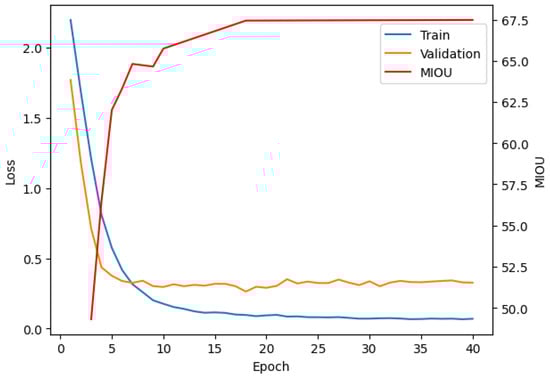 The results, illustrated in Figure 6, highlight the progression of training loss, validation loss, and mIoU during the training of the D-Former model on the StructScan3D dataset. The training and validation losses (blue and orange lines) are computed using the cross-entropy loss function, while the mIoU (red line) is calculated using standard per-class IoU across the validation set. The training loss (blue line) demonstrates a consistent decline, showcasing the model’s iterative refinement in minimizing discrepancies between predicted outputs and ground truth labels. The validation loss (orange line) stabilizes after approximately 15 epochs, suggesting strong generalization to unseen data and minimal overfitting. The mIoU (red line) shows a steady increase, reaching a final value of 67.5%.