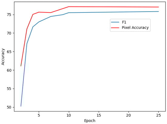 The evaluation of the F1 Score and Pixel Accuracy during the training process is presented in Figure 7, where the F1 Score (blue line) rises sharply in the early epochs and stabilizes around 75%, indicating a strong balance between precision and recall, especially for challenging elements like doors and windows. The Pixel Accuracy (red line) improves consistently, surpassing 78% by the end of training, showcasing the model’s reliability in correctly labeling a majority of pixels.