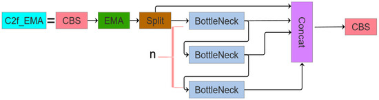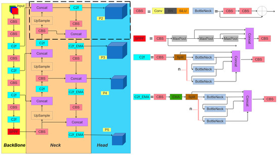 - Architectural Redesign: The original C3 module is replaced with a redesigned C2f module integrated with an Exponential Moving Average (EMA [32]) attention mechanism, forming the C2f_EMA module. This configuration optimizes the receptive field geometry to enhance the detection precision for smaller targets.