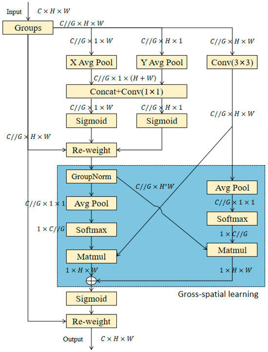 - 1 × 1 Branch: Intra-group channel attention is aggregated through element-wise multiplication to achieve diversified cross-channel interactions.