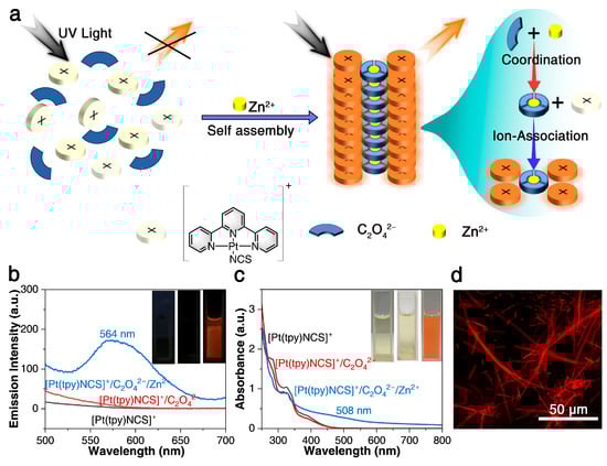 In order to construct a three-component supramolecular dual-mode sensing system successfully, C2O42− was first introduced to coordinate Zn2+, because it has a high coordination constant (lgKn = 8–9) with Zn2+ to form [Zn(C2O4)3]4− coordination anions. In addition, the monocationic tripyridyl platinum (II) complex [Pt(tpy)NCS]+ was chosen because the monomer does not emit light in the aqueous medium due to the thermally accessible 3d-d excited state [], and the π-conjugated tripyridyl ligands can produce rich photophysical properties through improved orbital interactions []. At the same time, according to previous studies of our research group, among the numerous tripyridyl platinum (II) complex, -NCS ligands can lead to tighter Pt-Pt interactions of crystals, lower band between HOCO and LUCO, and therefore more red-shift spectra are more likely to be achieved []. Therefore, when Zn2+, C2O42−, and [Pt(tpy)NCS]+ encounter, Zn2+, C2O42− can be rapidly converted into [Zn(C2O4)3]4− coordination anion in the initial stage, and then four [Pt(tpy)NCS]+ cations combine with [Zn(C2O4)3]4− to form an ion pair. In the supramolecular self-assembly process, Pt-Pt and π-π interactions between non-radiating [Pt(tpy)NCS]+ are formed, resulting in significant color changes and turn-on luminescence, as shown in Figure 1a.