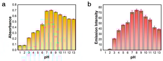The effect of pH on (a) absorption intensity at 508 nm and (b) emission intensity at 564 nm of [Pt(tpy)NCS]+/C2O42−/Zn2+ supramolecular system.