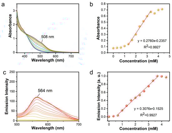 (a) Absorption spectrum variation of [Pt(tpy)NCS]+/C2O42− solution after adding Zn2+. (b) Absorption intensity at 508 nm as a function of Zn2+ concentration. (c) Fluorescence spectrum variation of [Pt(tpy)NCS]+/C2O42− solution after adding Zn2+. (d) Emission intensity at 564 nm as a function of Zn2+ concentration (different color lines in (a,c) represent different concentrations of Zn2+ added).