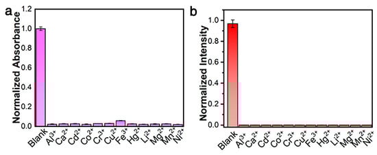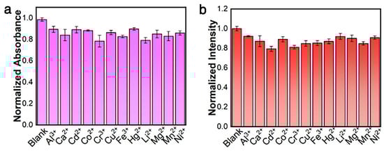 The anti-interference ability of [Pt(tpy)NCS]+/C2O42−/Zn2+ supramolecular system to Zn2+ detection was discussed. In the [Pt(tpy)NCS]+/C2O42− solution, changes in the intensity of absorption and emission were recorded when three times equivalent interfering metal ions coexisted with Zn2+, and the results are shown in Figure 5a,b. It can be observed that the presence of all interfering metal ions has no significant effect on the two-mode signal. The results show the excellent anti-interference performance of [Pt(tpy)NCS]+/C2O42−/Zn2+ supramolecular system for Zn2+ detection.