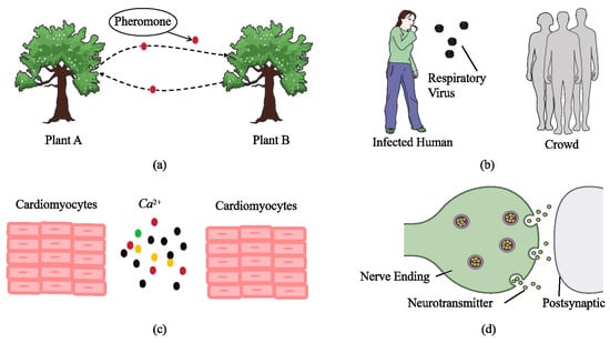 - Nakano, T.; Moore, M.J.; Okaie, Y.; Enomoto, A.; Suda, T. Cooperative Drug Delivery through Molecular Communication among Biological Nanomachines. In Proceedings of the 2013 IEEE International Conference on Communications Workshops (ICC), Budapest, Hungary, 9–13 June 2013; IEEE: Piscataway, NJ, USA, 2013; pp. 809–812. [Google Scholar]
