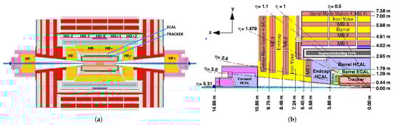 The subdetectors of the HCAL: (a) longitudinal view of the HB, HE, HF, and HO subdetectors on CMS [52]; and (b) longitudinal view of one quadrant of CMS with segmentation angle specifications of the , where the origin denotes the interaction point [31,53].