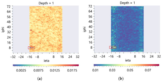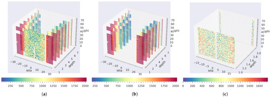 We utilized the digi-occupancy data of the online DQM system of the CMS experiment to train and validate our models. The data contain healthy digi-occupancy maps with a 20 fC minimum threshold and were selected from certified good collision runs, as referred to by the “Golden JSON” of CMS. The digi-occupancy datasets were collected in 2018 during the LHC Run-2 collision experiment with a received luminosity per lumisection of up to pb−1 and up to 2250 events. The source and target datasets contain three-dimensional digi-occupancy maps for the HE and HB subsystems of the HCAL, respectively (as shown in Figure 3).