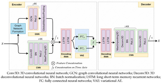 The architecture of the proposed AE for the GraphSTAD system [6]. The GNN and CNN provide spatial feature extraction for each time step, and the RNN network captures the temporal behavior of the extracted features. The feature extraction incorporates the GNN for back-end physical connectivity among the spatial channels, CNN for regional spatial proximity of the channels, and RNN for temporal behavior extraction. contains RNNs and deconvolutional neural networks to reconstruct the ST input data from the low-dimensional latent features.