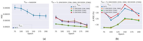 Reconstruction performance of the TL on spatial networks across different epochs: (a) test MSE loss, where the bars show the dispersion of five repeated experiments; (b) the average relative difference between the MSE loss and no-TL. TL is applied with on the encoder and decoder using TL-4: ENCODER[CNN, GNN], DECODER[CNN], and on the encoder using TL-1: ENCODER[GNN], TL-2: ENCODER[CNN], and TL-3: ENCODER[CNN, GNN]. The no-TL model starts to saturate at .
