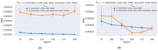 We investigated TL on the temporal RNNs (LSTM layers) in both the encoder and decoder networks, along with the spatial learning networks (CNNs and GNNs), using = TL-4 and = TL-3—the best performing TL for spatial networks across epochs (see Figure 7).