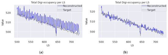 Digi-occupancy map reconstruction on sample ST data from the test set. The model was trained using TL-6, and the inference was executed (a) without and (b) with LSTM state preservation across time windows. The AE operates on ST maps, but the curves in these plots correspond to the aggregate renormalized per LS to illustrate the model’s performance in handling the fluctuation across lumisections.
