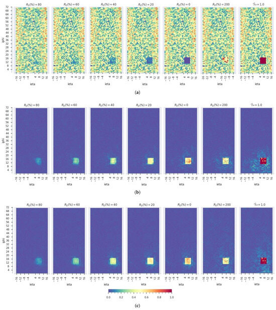 A sample digi-occupancy map (year = 2018, RunId = 325,170, LS = 15): (a) digi-occupancy map for the HE and HB together; (b) the source system HE channels are placed in , , and depth ; and (c) the target system HB channels are placed in , , and depth . The HE and HB share similarities and differences in tasks, calorimeter technology, and data characteristics. The missing sector at (b) corresponds to the two failed HE-RBX sectors during the 2018 collision runs.