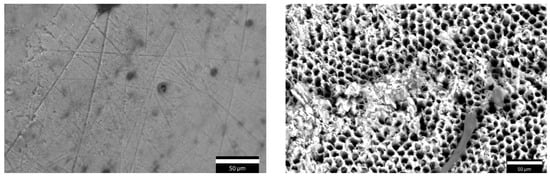 SEM images were acquired using an accelerating voltage of 15 kV and a working distance of about 8.5 mm in two conditions: before the demineralization process and after the 96 h demineralization protocol. An example of the same tooth surface is shown in Figure 2 before (left) and after (right) the demineralization process. On the left, sound enamel is visible, featuring a smooth surface with some minor pits, impurities, and scratches. On the right, the enamel surface looks severely damaged due to the in vitro demineralization: enamel prism cores are dissolved and only the hexagonal structure of HA crystals is retained. As can be seen, the demineralized enamel is characterized by a porous morphology.