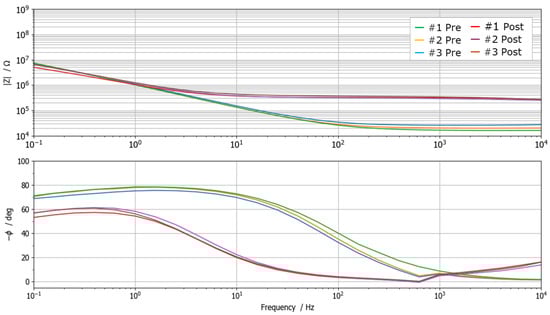 Impedance spectra collected on the same tooth sample before and after demineralization. Spectra were acquired three times to assess measurement repeatability. A distinct phase shift of approximately one frequency decade, attributable to the demineralization process, is readily observable. The negligible phase discontinuity present at 10 kHz is an instrumental artefact due to current autoranging.