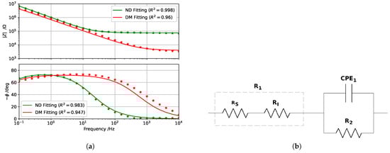 As all impedance spectra exhibited behavior that can be associated with a first-order system (i.e., one time constant), they were modeled using the equivalent electrical circuit reported in Figure 4b. The model employs three circuital elements: two resistors ( and ) and one Constant-Phase Element (). Such an equivalent model is extremely useful because it allows to identify how the single physical and chemical factors contribute to the impedance measurement.