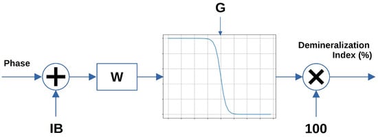 The classification parameters that can be tuned are Input Bias (IB), Weighting Factor (W), and sigmoid gain (G). These parameters were configured to minimize the classifier’s error rate over the training dataset with the aim of relating them to their statistical meaning. Firstly, IB was set to 65, derived from the average phase value of demineralized teeth and adding 1.5 times the phase standard deviation. G determines the smoothness of the decision function, with higher G values involving a steeper function. The lowest error rate is achieved with a gain value of 2. Finally, W was set to 1 in order to avoid alterations to the input phase.