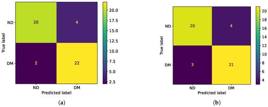 (a) Classification results of the single-neuron binary classifier over a balanced dataset of 24 teeth, shown as confusion matrix. (b) Classification results of the MLP classifier using two hidden layers, respectively, of three and two neurons, shown as a confusion matrix. In both plots, labels ND and DM stand for “Non-Demineralized” and “Demineralized” teeth, respectively.