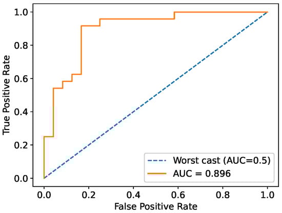 Additionally, the ROC (receiver operating characteristic) curve was computed and the AUC was estimated to be 0.894, as reported in Figure 7. In particular, the AUC values are very close to 1, indicating an excellent capability of the classifier to discriminate between the two tooth classes (demineralized and non-demineralized).