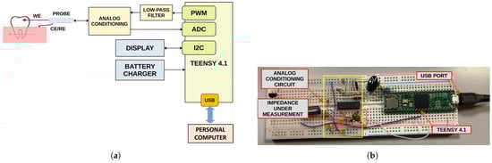 The prototype is arranged around the Teensy 4.1 (PJRC, Sherwood, Portland, OR, USA), a small commercial development board that embeds a powerful 32-bit ARM Cortex-M7 microcontroller, of RAM, and several other peripherals. A 16-bit unipolar Analog-To-Digital Converter (ADC) is available as well for directly acquiring analog signals. The block diagram of the system is shown in Figure 8a. The system implements both the impedance measurement and tooth classification, aiming to employ the lowest number of external components as possible in order to reduce the cost and the size of the device.