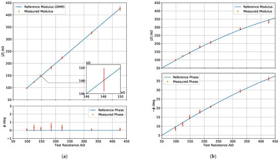 Preliminary characterizations of the prototype in terms of measurement accuracy of impedance modulus and phase: (a) for pure resistors in the range from 100 kΩ to 500 kΩ; (b) for an R–C parallel circuit obtained with a fixed capacitor of 18.2 nF while changing the resistor value between 100 kΩ and 500 kΩ.