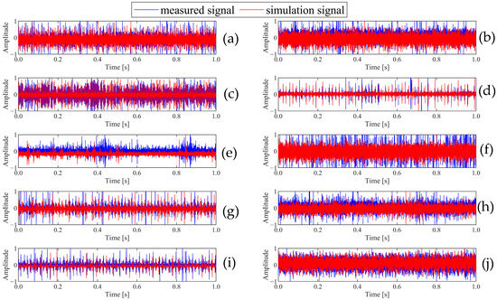 Time domain comparison of bearing fault simulation data and measured data: (a) normal, (b) IR007, (c) RE007, (d) OR007, (e) IR014, (f) RE014, (g) OR014, (h) IR021, (i) RE021, (j) OR021.
