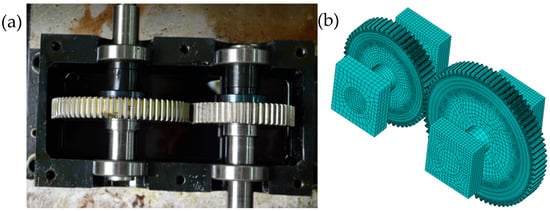 Single-stage gear train and finite element modeling. (a) Involute spur gears, (b) Finite element model of the gear transmission system.