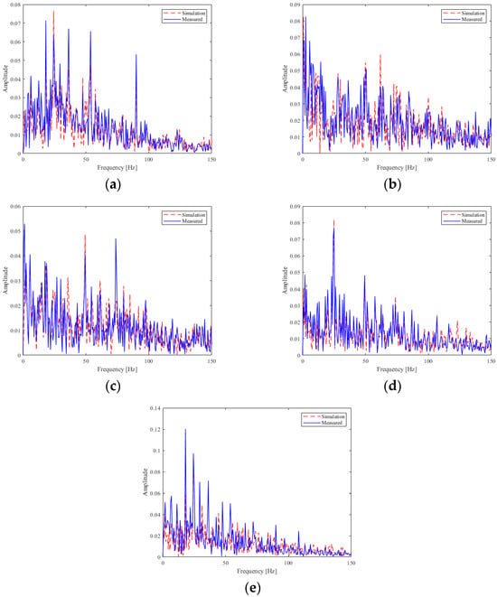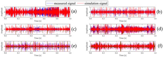 Figure 5a–f show the waveforms of the six gear states in the time domain. Figure 5 clearly shows that the overall trend of the simulation signal and the measured signal is basically consistent, but there are differences in some local details.