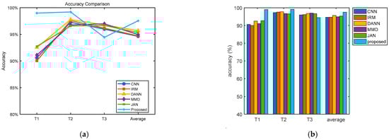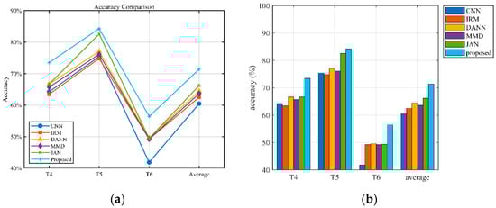 According to the gear data under four operating conditions, three different tasks were set up. As shown in Table 8, consistent with the bearing experimental setup, the simulation data are combined with the measured data to create a multi-source domain. Adversarial learning between these domains helps to learn more domain-invariant features. The experimental investigation is depicted in Figure 10 and Table 9. Relative to the experimental results of bearings, the experimental results of gears had relatively low accuracy, which was due to the large difference in the distribution of gear data under different working conditions, thus weakening the learning ability of the model to a certain extent. Relative to MMD and JAN, the average accuracy was increased by 7.7% and 5.17%, respectively.