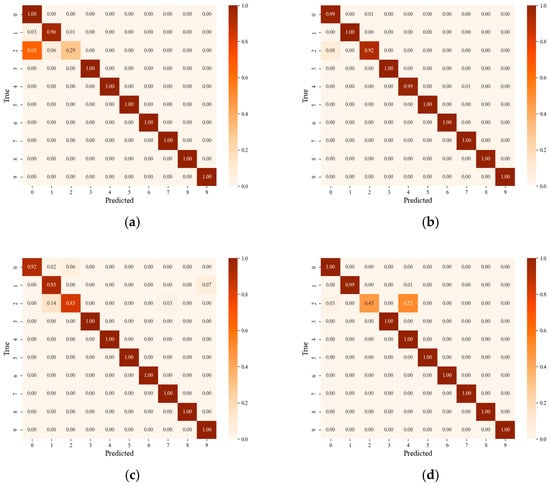 The results of four different tasks: (a) DANN T1, (b) Proposed T1, (c) DANN T3, (d) Proposed T3.