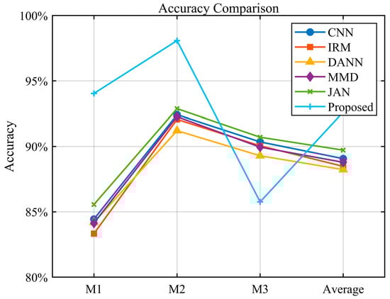 To comprehensively validate the effectiveness of the proposed approach, several commonly employed approaches were utilized for comparison. All approaches were implemented using the PyTorch (Version 1.13.1) framework and trained on a PC with an NVIDIA GPU GeForce RTX 4060, 32GB RAM, and an Intel Core i5-12400F CPU. (1) CNN: A basic CNN model was trained in multi-source domains to directly diagnose target domain faults. (2) IRM: A classic domain generalization method, Invariant Risk Minimization (IRM) [43]. (3) DANN [36]: Classical domain adversarial neural networks learn domain-invariant features. (4) MMD: MMD trained on multi-source data. (5) JAN: Deep transfer learning with joint adaptation networks (JAN) [44] trained on multi-source data. In the comparative experiment, to ensure the fairness of the results, this study carefully designed and detailed the parameter settings for different methods. Specifically, (1) All methods were evaluated using the same dataset and metrics to maintain consistency. (2) Key parameters and optimization techniques were standardized across all methods. For example, the learning rate was set to 0.0001, the batch size to 64, using the same CNN as a classifier, and Adam was used as the optimizer. (3) To minimize the impact of random factors on the results, each method was executed 10 times, and the average performance was reported as the final result.