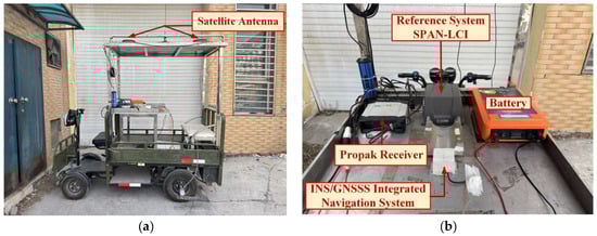 To validate the effectiveness of the proposed adaptive unscented Kalman filtering method based on the MVC for the MEMS-INS/GNSS-integrated navigation system, a vehicular navigation experimental platform was established, and field tests were conducted to evaluate the navigation performance of the proposed method. As shown in Figure 1, the vehicular experimental platform is primarily equipped with the following systems: (1) A MEMS-INS/GPS-integrated navigation system, comprising a triaxial MEMS gyroscope, accelerometer, and GPS receiver, serves as the main experimental system for collecting test data. (2) A NovAtel SPAN-LCI high-precision integrated navigation system, acting as the reference system, provides benchmark information. The specific configurations and key parameters of the relevant systems and sensors are detailed in Table 1.