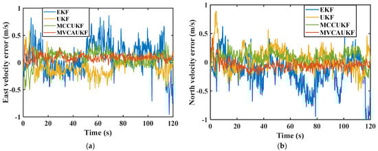 Velocity errors of the various algorithms: (a) east velocity error; (b) north velocity error.