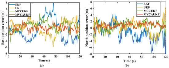 Figure 2 compares the east and north velocity errors obtained by the four different algorithms, and the east and north position errors obtained by the four different algorithms are shown in Figure 3. Furthermore, Table 2 summarizes the root mean square error (RMSE) of the east and north positions and velocities for the different filtering algorithms, providing a quantitative comparison of the navigation algorithms. The RMSE quantifies the deviation between the estimated values and the reference data, exhibiting heightened sensitivity to outliers within the dataset. A smaller RMSE value indicates superior navigational accuracy, reflecting greater robustness against anomalous measurements. In our paper, the RMSE can be defined as follows: