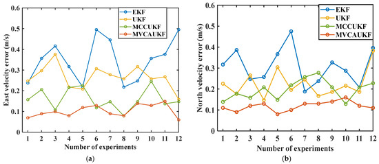 Velocity errors from the various methods in experiments 1–12: (a) east velocity error; (b) north velocity error.