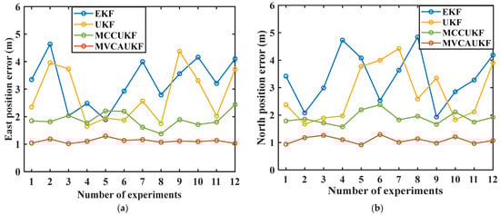 Position errors from the various methods in experiments 1–12: (a) east position error; (b) north position error.