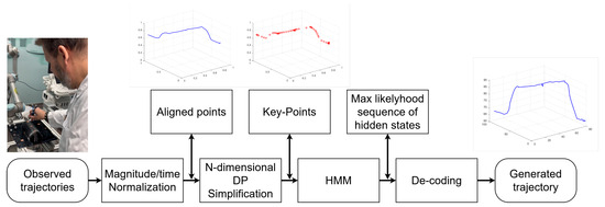 The acquired multidimensional trajectories undergo filtering and magnitude-based normalization as preprocessing steps before being simplified using the N-dimensional modification of the Douglas–Peucker algorithm. The simplified trajectories are then encoded according to a predefined resolution for each set of magnitudes and subsequently used to train the learning model (HMM). Further details on the applied methodology can be found in [19].