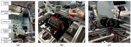 Finally, Figure 2c presents the configuration of the force sensor’s reference system, which is used to register the interaction forces exerted on the platform during trajectory execution. The force sensor provides real-time measurements along multiple axes, enabling a precise quantification of contact forces and torques. This information is essential for analyzing force distribution patterns and refining robotic models based on human demonstrations.