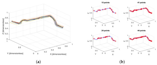As previously mentioned, a total of 30 trajectories were acquired for this study. On average, each acquired trajectory consists of 73 points, with the shortest trajectory containing 42 points and the longest one comprising 102 points. After applying the N-dimensional simplification process, the shortest trajectory is reduced to 18 points, while the longest one is simplified to 88 points, resulting in an average of 53 points per trajectory.