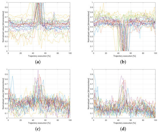 Figure 3a shows the normalized trajectories performed by different users, highlighting how the procedure unifies the scale across magnitudes while retaining the essential shape and variability of the original data.